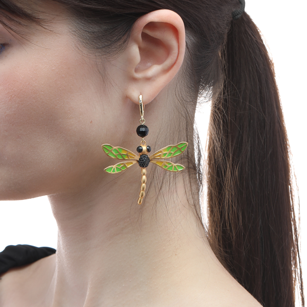 Описание: Изготовлено из ювелирного сплава на основе латуни с гальваническим покрытием матовым золотом. Изделие вручную расписано ювелирной краской зеленого и желтого цвета, покрыто эмалью и украшено черным агатом и фианитами.