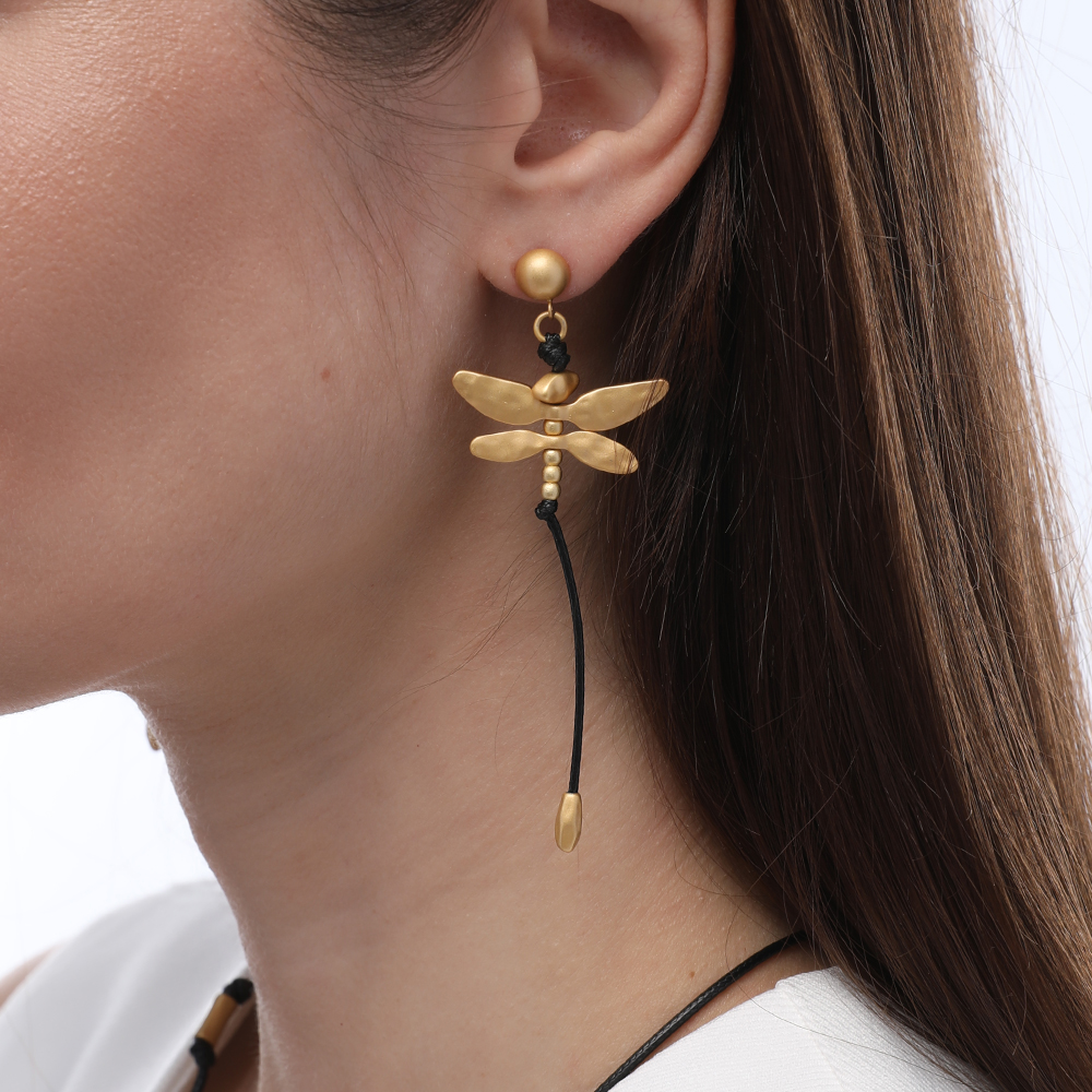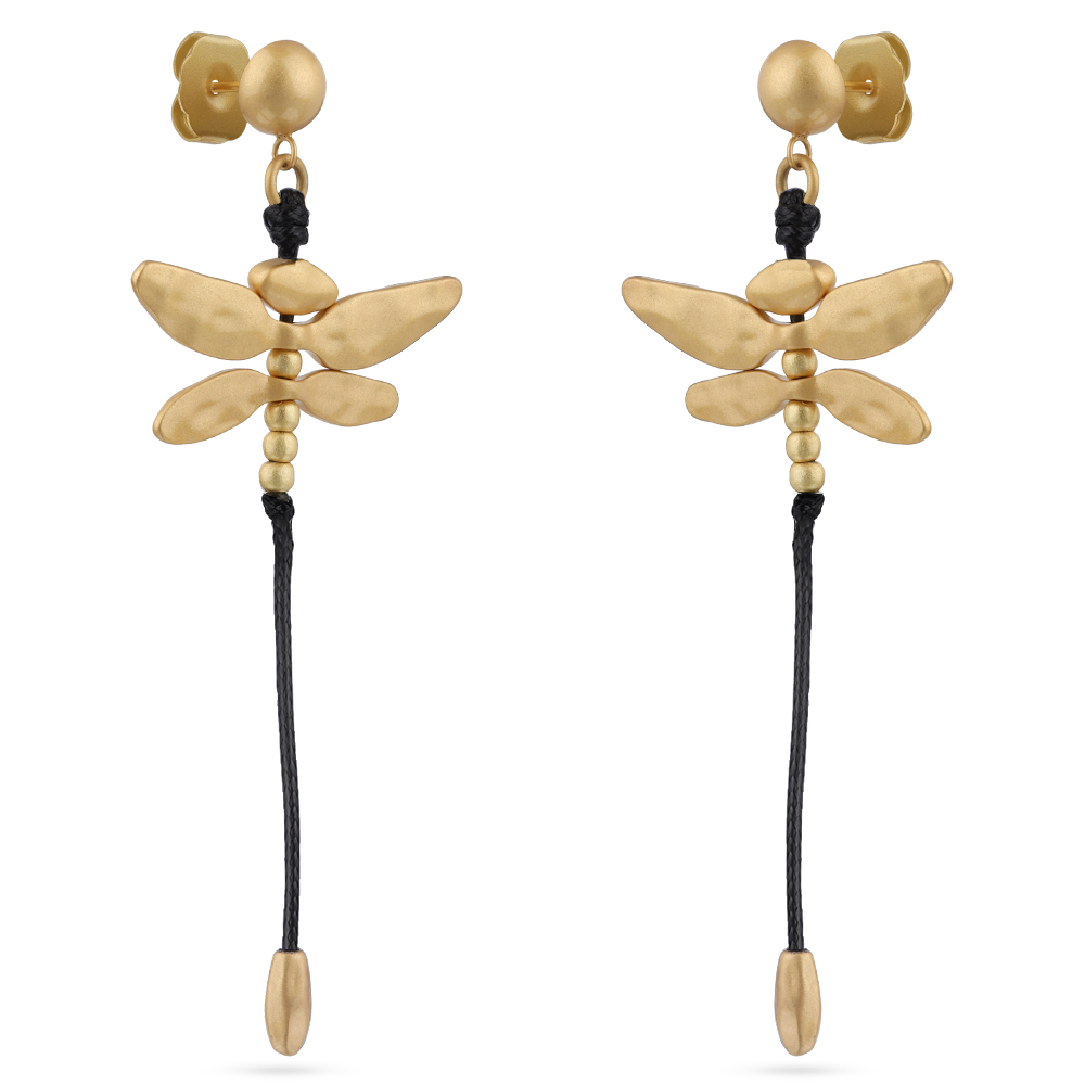Описание: Изготовлено из ювелирного сплава на основе латуни с гальваническим покрытием матовым золотом. Длина сережек на черном текстильном шнурке 8см. Застёжка — гвоздики.