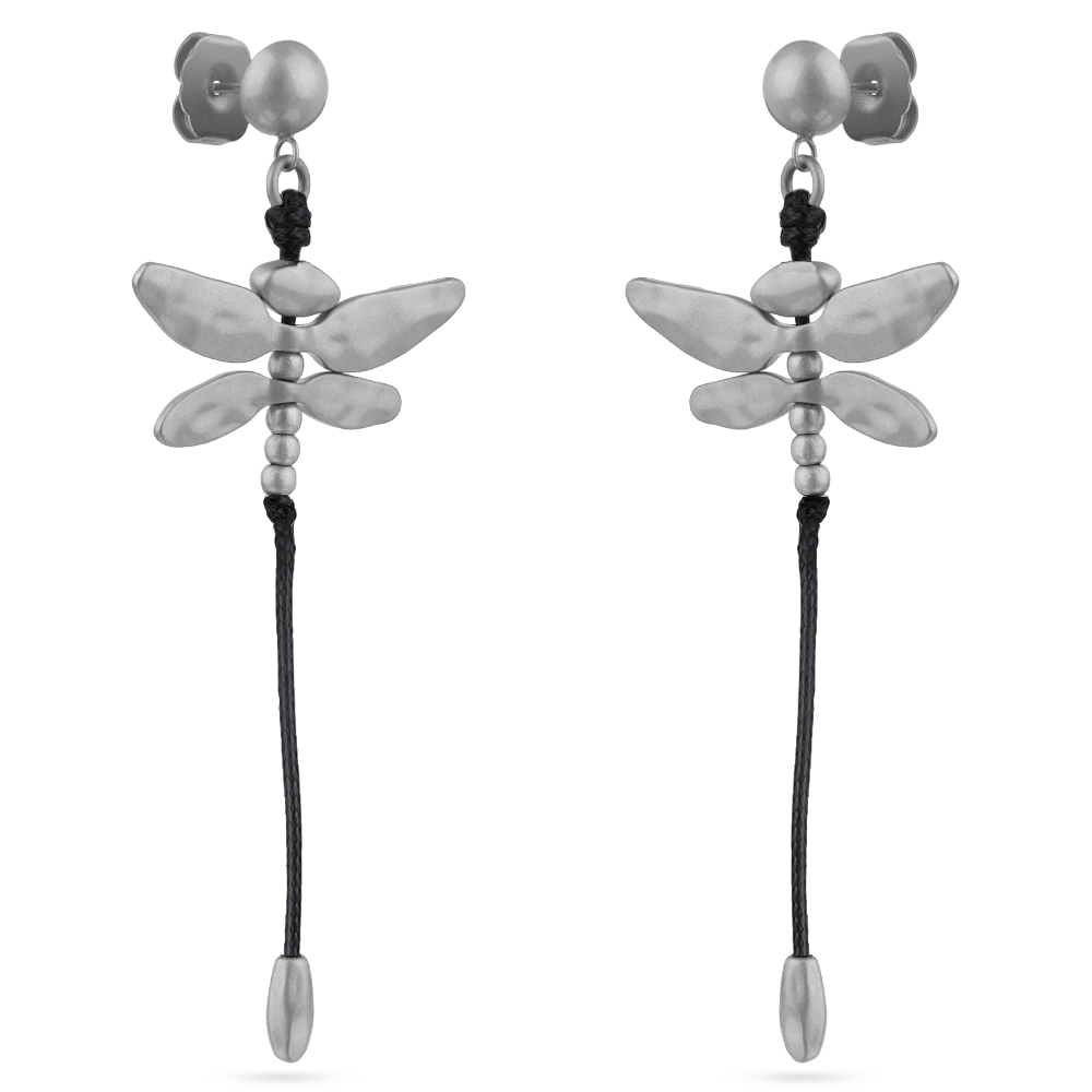 Описание: Изготовлено из ювелирного сплава на основе латуни с гальваническим покрытием матовым родием. Длина сережек на черном текстильном шнурке 8см. Застёжка — гвоздики.