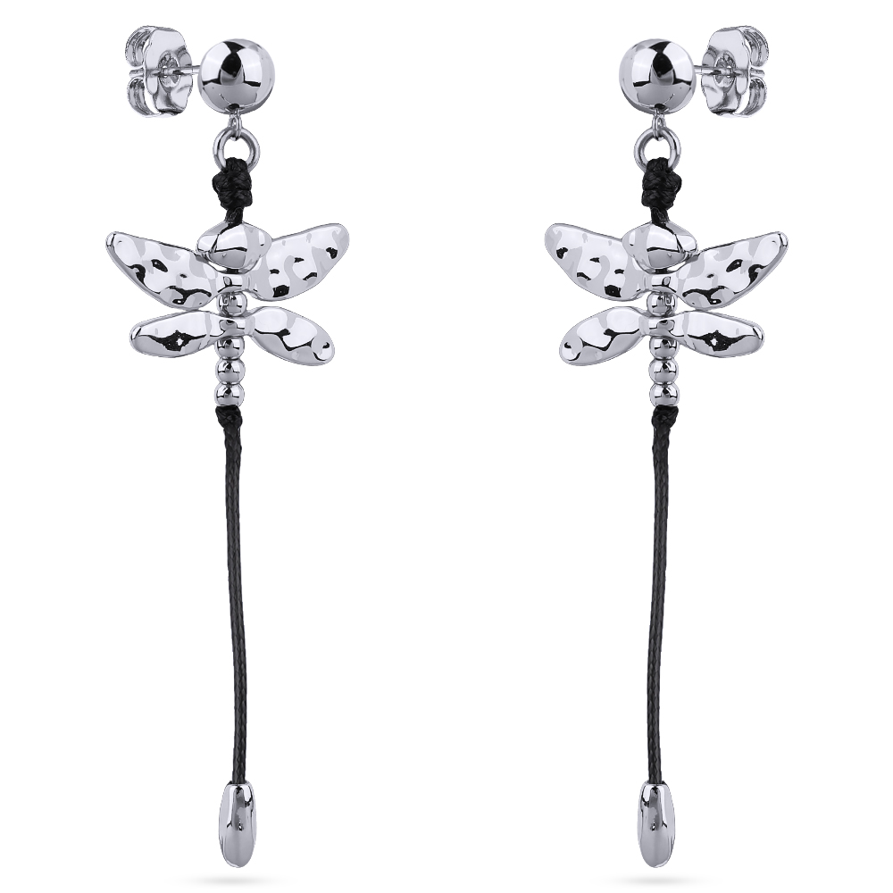 Описание: Изготовлено из ювелирного сплава на основе латуни с гальваническим покрытием родием. Длина сережек на черном текстильном шнурке 8см. Застёжка — гвоздики.