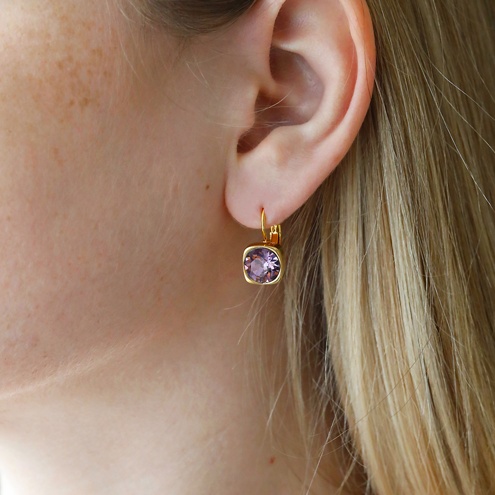 Описание: Изготовлено из ювелирного сплава на основе латуни с гальваническим покрытием золотом. Изделие украшают кристаллы SW аметистового цвета диаметром 8мм. Длина серьги 1, 8см.