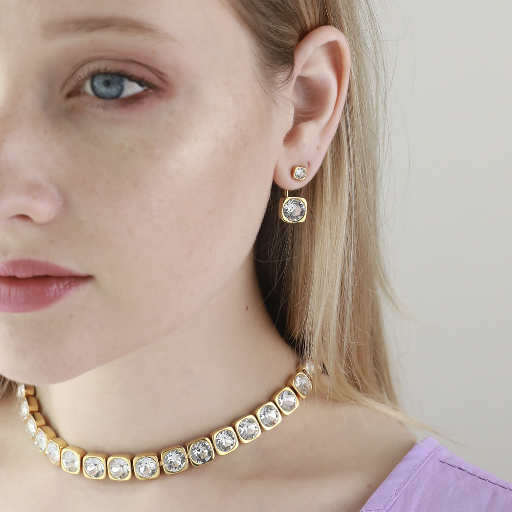 Описание: Изготовлено из ювелирного сплава на основе латуни с гальваническим покрытием золотом. Изделие украшают белые кристаллы SW диаметром 4 и 8мм. Длина серьги 2.3см. Застежка — гвоздики.