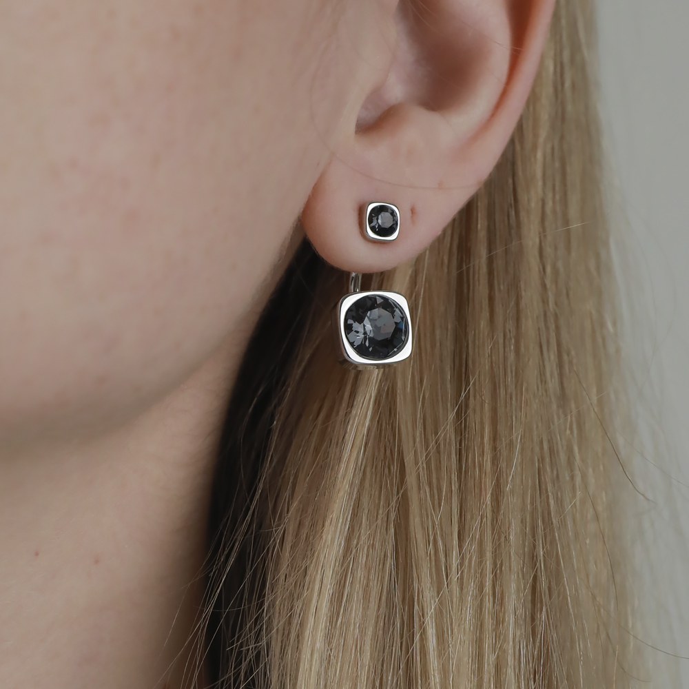 Описание: Изготовлено из ювелирного сплава на основе латуни с гальваническим покрытием родием. Изделие украшают кристаллы SW диаметром 4 и 7мм темно-серого цвета. Длина серьги 2.3см. Застежка-гвоздики.