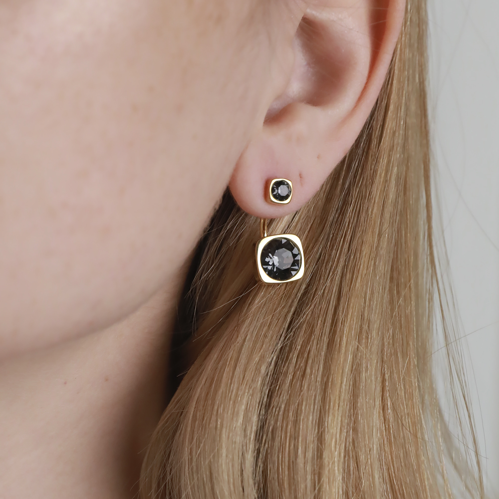 Описание: Изготовлено из ювелирного сплава на основе латуни с гальваническим покрытием золотом. Изделие украшают темно-серые кристаллы SW диаметром 4 и 8мм. Длина серьги 2.3см. Застежка-гвоздики.