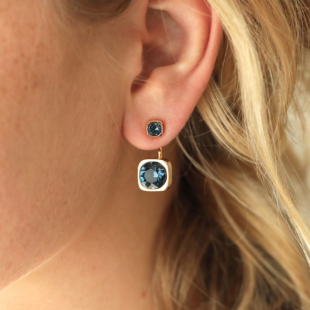 Описание: Изготовлено из ювелирного сплава на основе латуни с гальваническим покрытием золотом. Изделие украшают темно-синие кристаллы SW диаметром 4 и 8мм. Длина серьги 2.3см. Застежка-гвоздики.