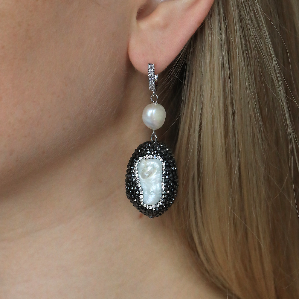 Серьги (жемчуг барочный белый, кристаллы черные; покрытие родий)