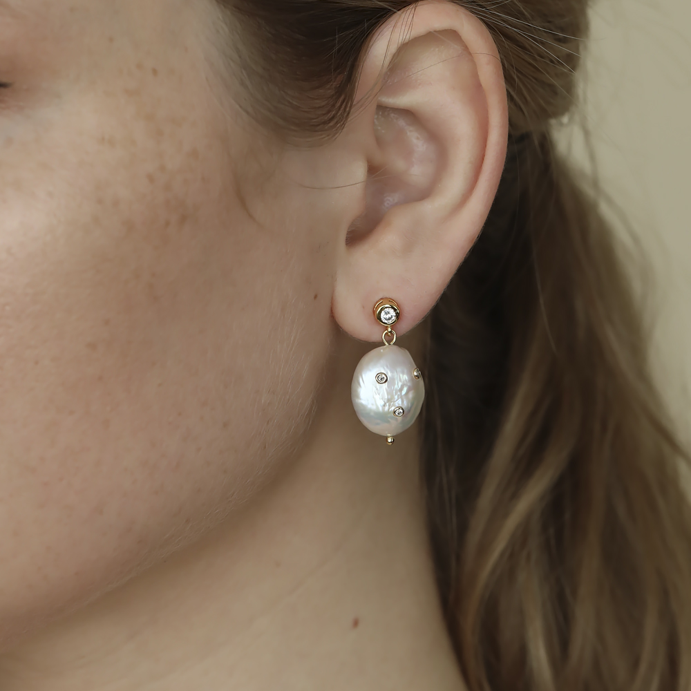 Описание: Изготовлено из ювелирного сплава на основе латуни с гальваническим покрытием золотом. Изделие украшают жемчуг диаметром 20мм и фианит белого цвета. Длина 3см. Застежка-гвоздики.