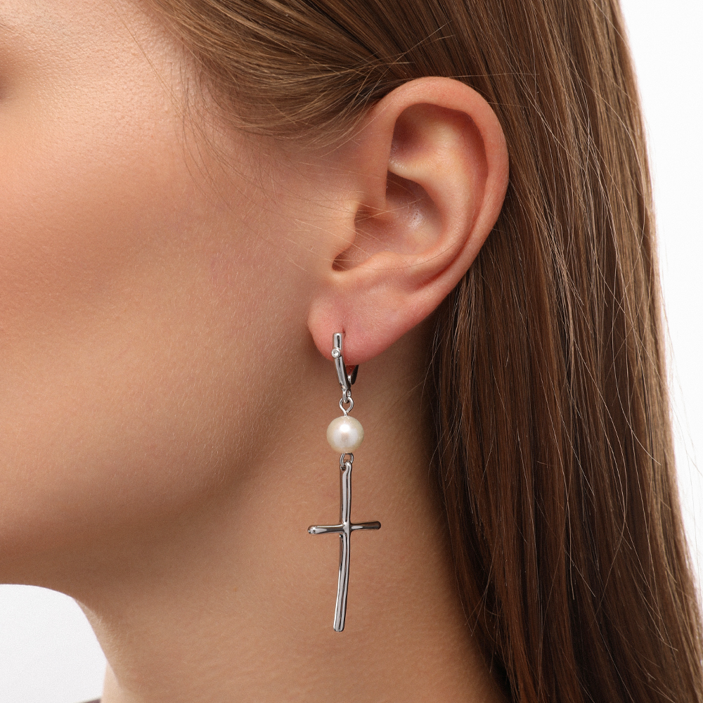 Описание: Изготовлено из ювелирного сплава на основе латуни с гальваническим покрытием родием. Изделие украшает натуральный жемчуг белого цвета диаметром 8мм. Размер серьги 6, 3х2см. Английская застежка.