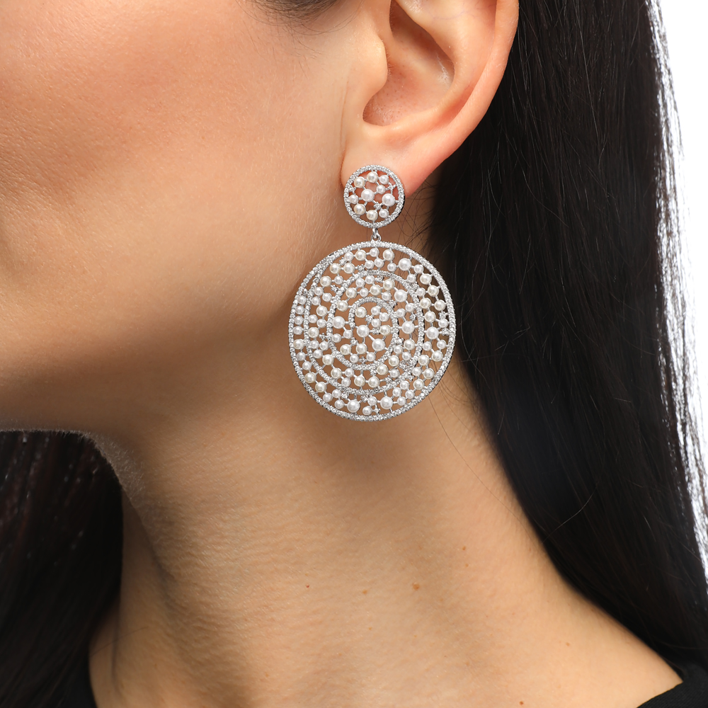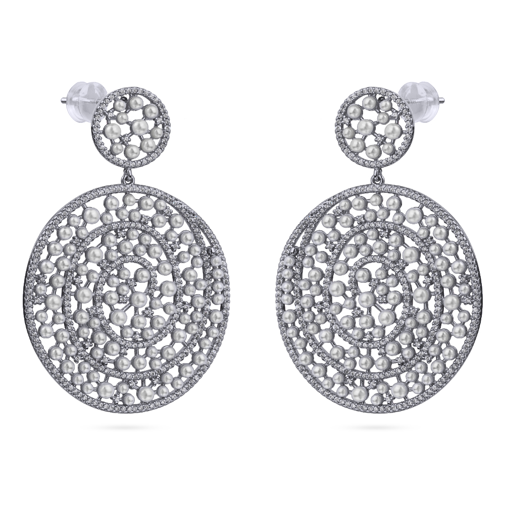 Описание: Изготовлено из ювелирного сплава на основе латуни с гальваническим покрытием родием. Изделие украшают жемчуг и белый фианит. Размер серьги 6х4см. Застежка-гвоздики.