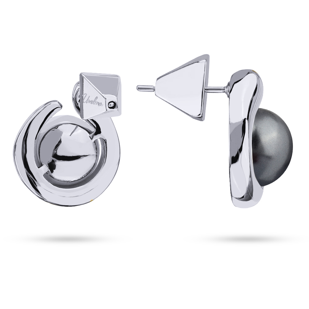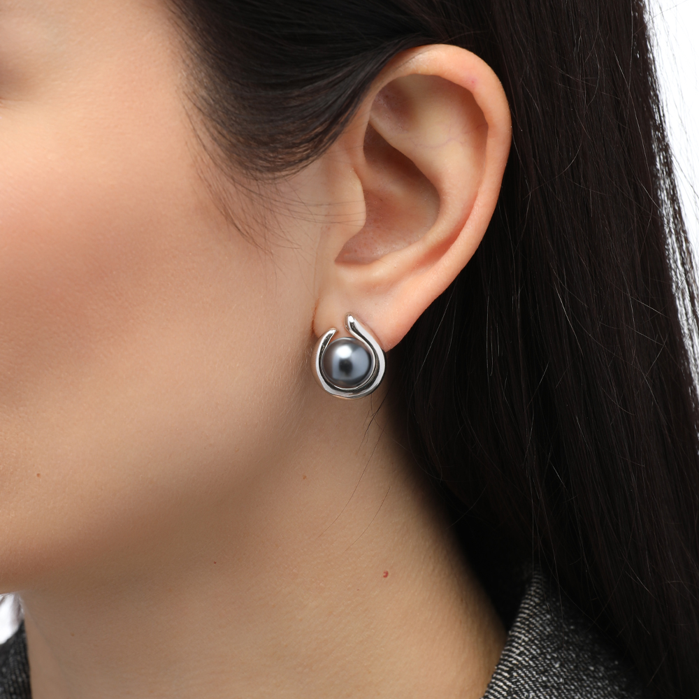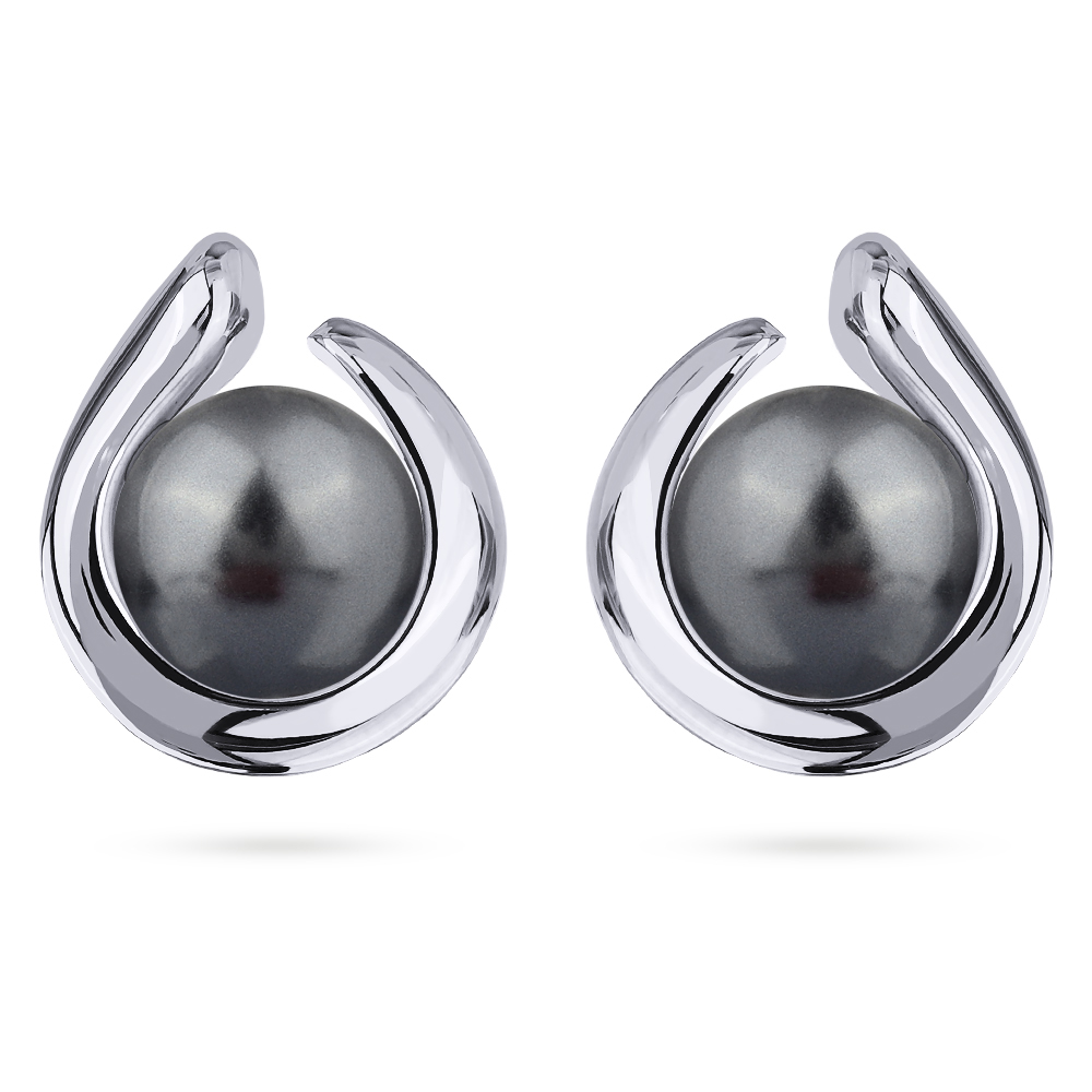 Описание: Изготовлено из ювелирного сплава на основе латуни с гальваническим покрытием родием. Изделие украшает майорский круглый жемчуг темно-серого цвета диаметром 12мм. Размер серьги 1.8х1.6см. Застежка-гвоздики.