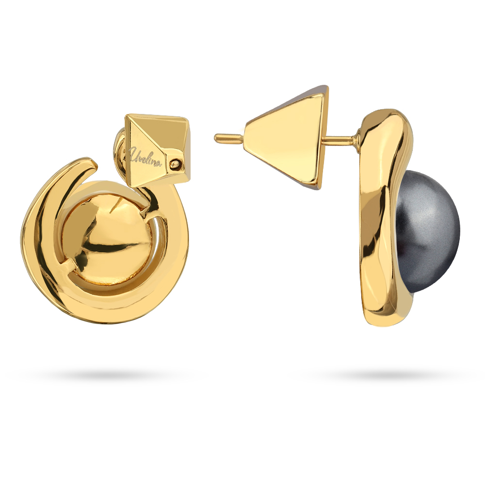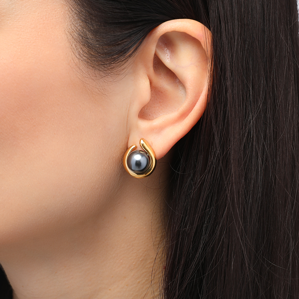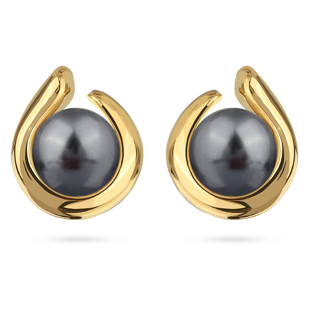 Описание: Изготовлено из ювелирного сплава на основе латуни с гальваническим покрытием золотом. Изделие украшает майорский круглый жемчуг темно-серого цвета диаметром 12мм. Размер серьги 1.8х1.6см. Застежка-гвоздики.